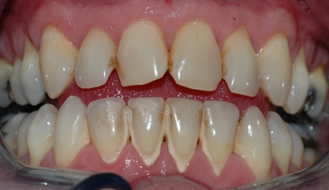 Her kan man se misfarging og tannsten på tennenes fremside.